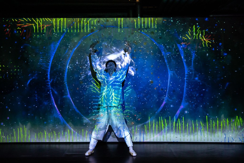 <TechiEon> is a Taekkyeon performance – a traditional Korean martial arts and UNESCO Intangible Cultural Heritage of Humanity – that re-scales the biodiversity of eon, formed along with the development of human technology. Employing AI-based Augmented Reality (AR), sound generation, and Body Art, Taekkyeon Masters and digital artists overlap different senses of time and space in multi-layered media. The performance explores the organismic forms and effects of the media circulating in ecological and technological spheres of the planet. Such understanding of planetary interactions and dynamics among media and technology links to the underlying philosophy of Taekkyeon – “symbiosis” – that has its own history of over two millenniums. It aims to redistribute the senses towards the climate and habitus of the technological eons to come, while also encompassing human-nature history and its particular constructions.