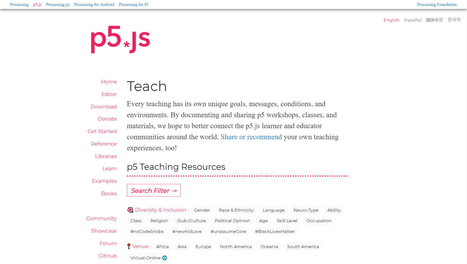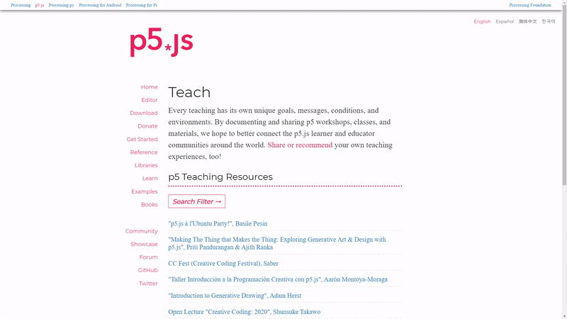 Reaching out to 50 and more p5 educators around the world, “p5 for 50+ teaching” aims to contribute in documenting, showcasing, and sharing teaching experiences, specifically by re-using the existing features of p5js.org. The project was mentored by Qianqian Ye.