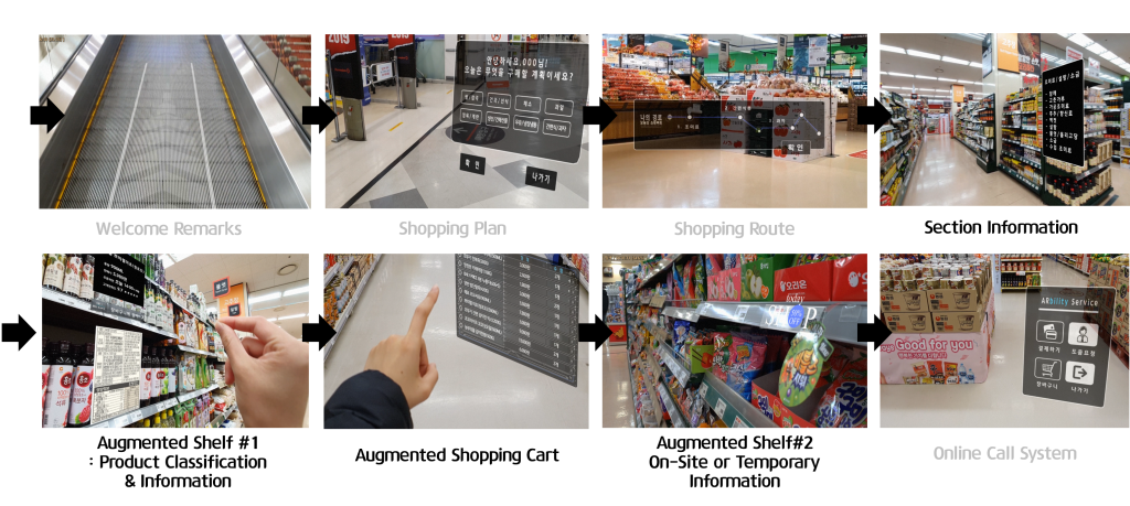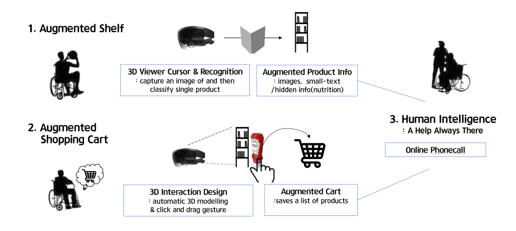 In this project, the researchers aim to provide an augmented shopping system and accessible interaction designs for enhanching the inclusion of wheelchair users into the public environment. Addressing the fact that, in most cases, public facilities including brick-and-mortar shopping venues are constructed based on the standards of the non-physically-challenged; the researchers present AR-based shopping system prototype that leverages AR interfaceand image recognition techniques to offer an augmented shopping experience to wheelchair users. The prototype allows wheelchair users to have same shopping experience as compared to non-motor impaired by constructing augmented reality within offline store. Wheelchair users wear AR glasses (i.e. Hololens 1) during shopping.W hen user input is requested, the prototype infers product information in front of user and renders real product as 3D object.